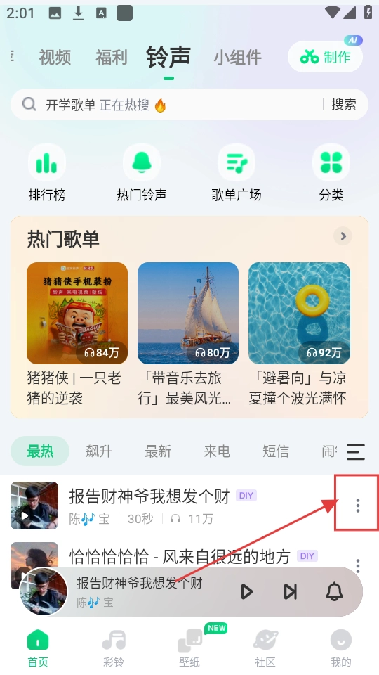 铃声页面包含热门歌单等内容,挑选你喜爱的铃声后,点击右侧的三点图标,就能展开相关操作选项。