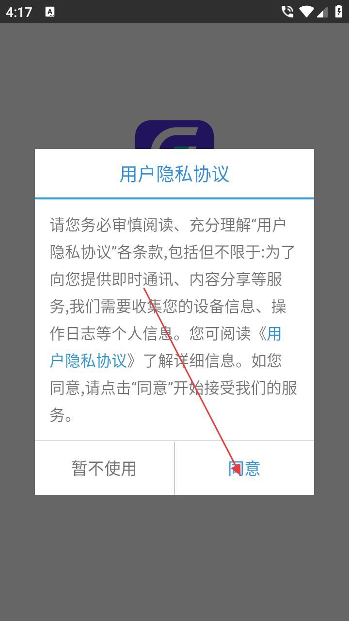 1、进入运到了,查看【用户隐私协议】,点击“同意”开启使用流程。