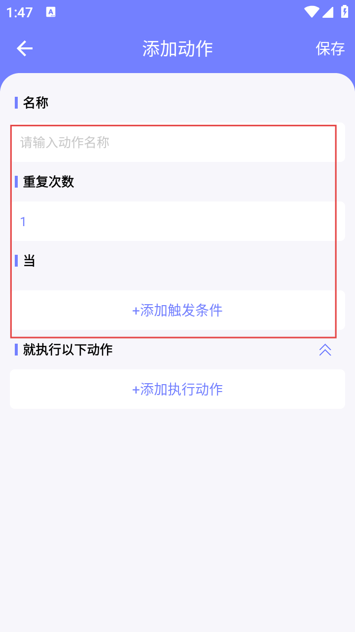 2、在添加动作页,填动作名称、重复次数,点【+添加触发条件】【+添加执行动作】设规则,点【保存】。