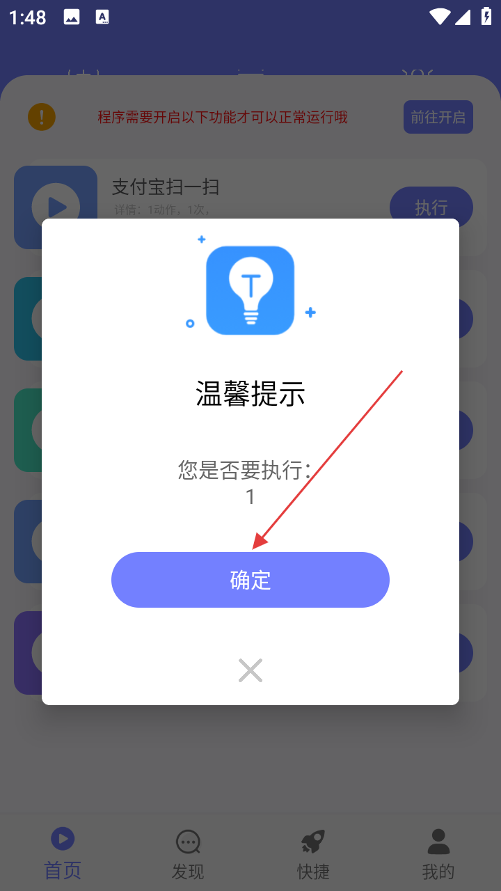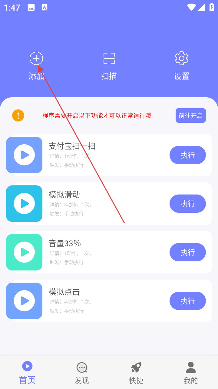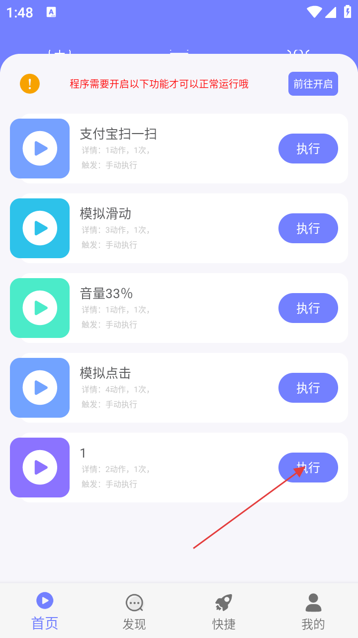 3、回到首页,找到添加好的动作,点右侧【执行】按钮。