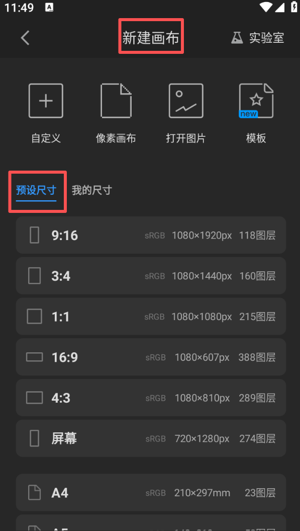 3、操作过程中,界面会提供新建画布可预设尺寸。