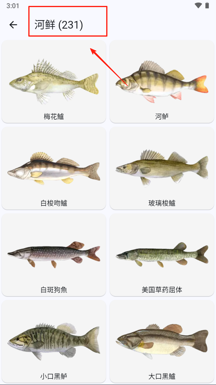 2、在鱼类分类中选择“河鲜”,查看河鲜鱼类列表及详细信息。