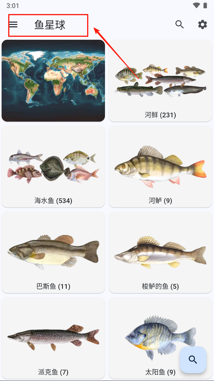 1、点击“鱼星球”应用图标,进入应用主界面,浏览不同鱼类分类。