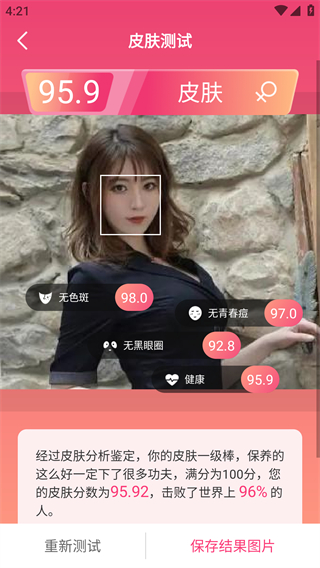 2、皮肤测试功能,基于人工智能及大数据评估你的皮肤,依据色斑、青春痘、黑眼圈、皮肤健康等维度来分析皮肤状态。