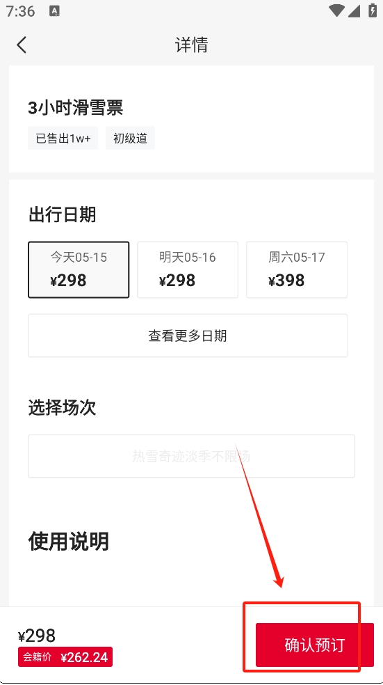 4、在详情页面,选择适合的出行日期,确认信息无误后,点击“确认预订”按钮,完成滑雪票的购买流程。