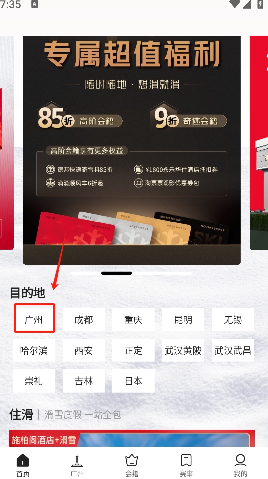 1、在应用首页的目的地列表中,点击“广州”按钮,进入广州热雪奇迹滑雪场的页面。