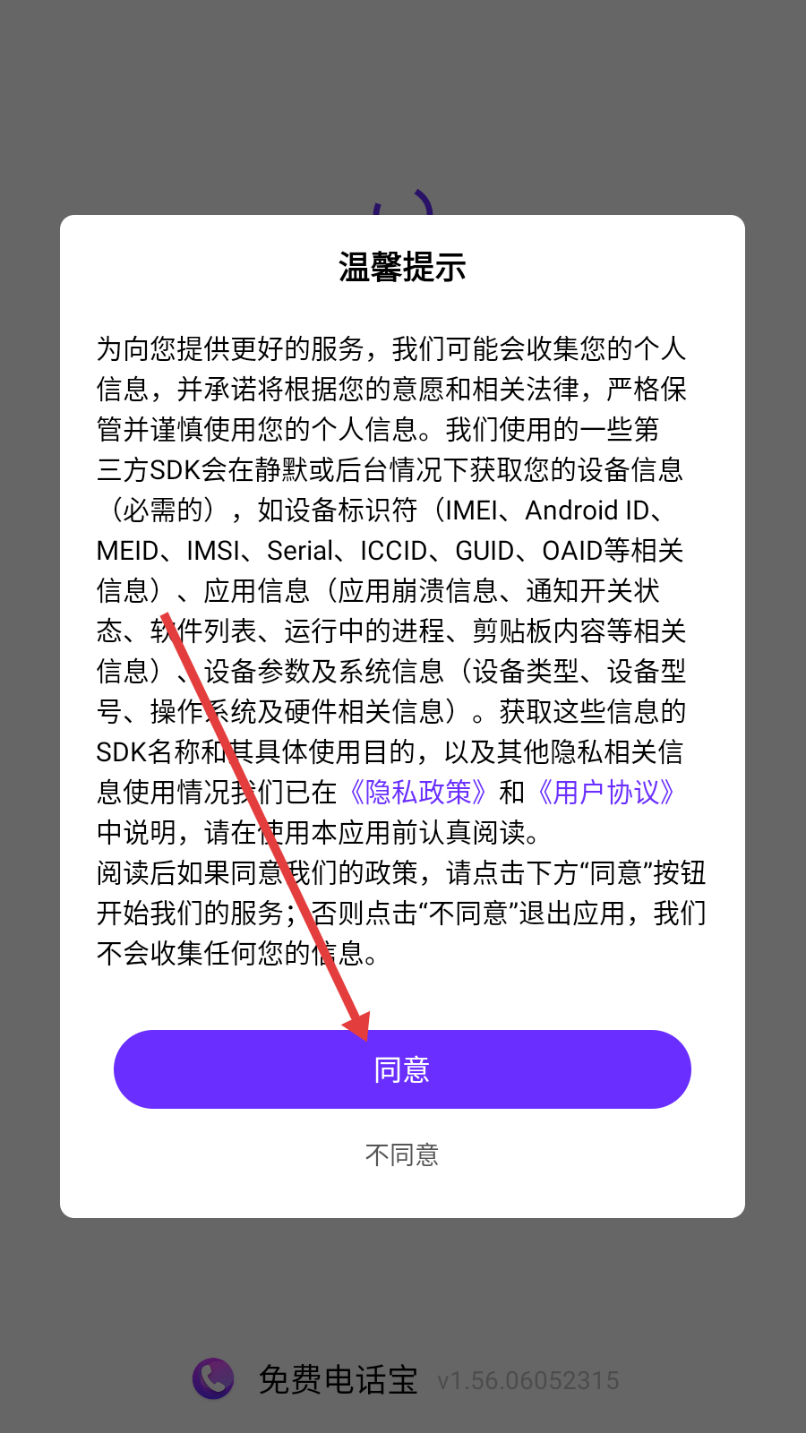 1、首次打开免费电话宝,弹出【温馨提示】,阅读后点击【同意】,进入应用使用流程。