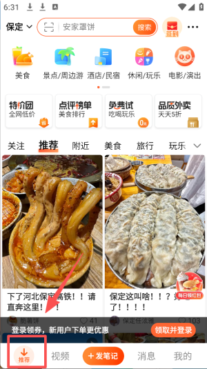 1、在首页点击“推荐”标签,查看推荐的美食和娱乐信息。
