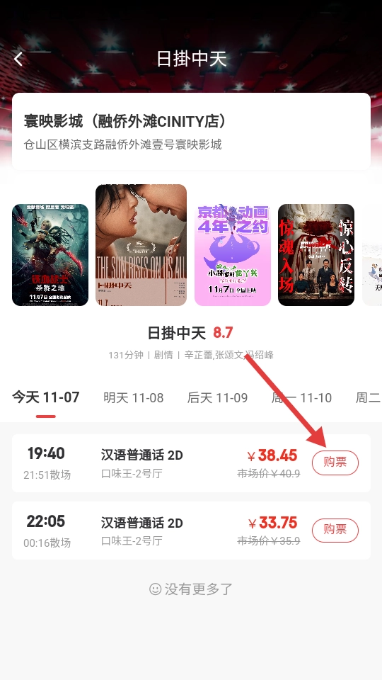 在影城场次页面,挑选合适的场次后点击【购票】按钮就行。