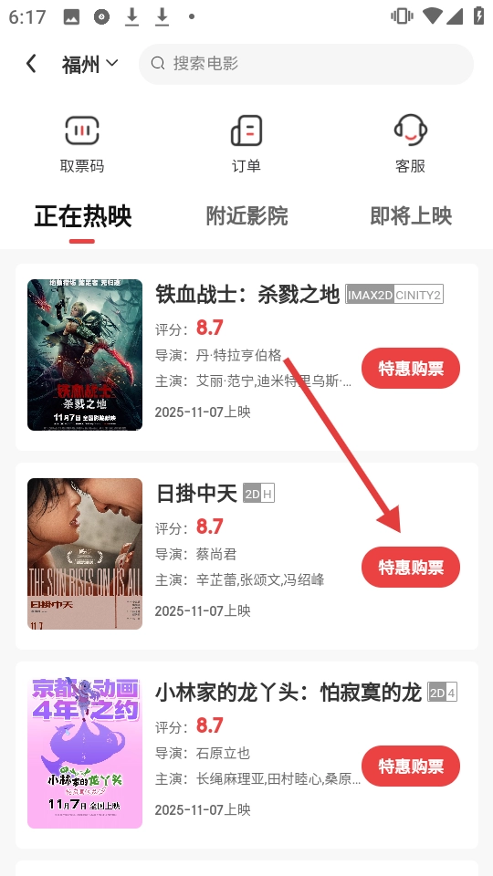 在【正在热映】的影片列表里,找到《日掛中天》这部作品,然后点击对应的【特惠购票】按钮。