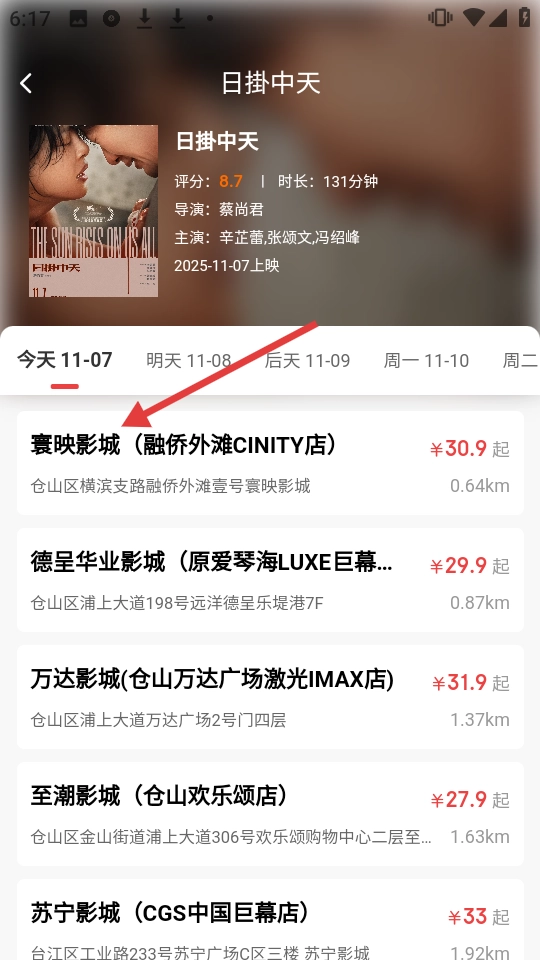 在《日掛中天》的影城选择界面,点击【寰映影城(融侨外滩CINITY店)】。