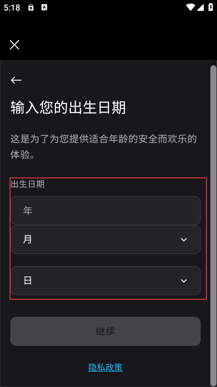 4、在输入出生日期界面,选择年、月、日,完成年龄验证以获取适合年龄的游戏体验。