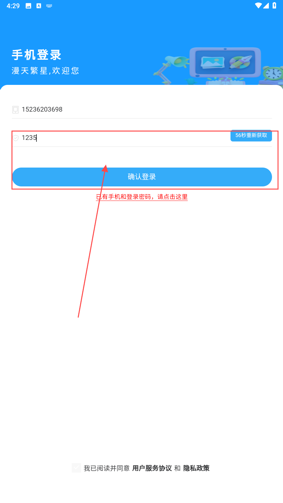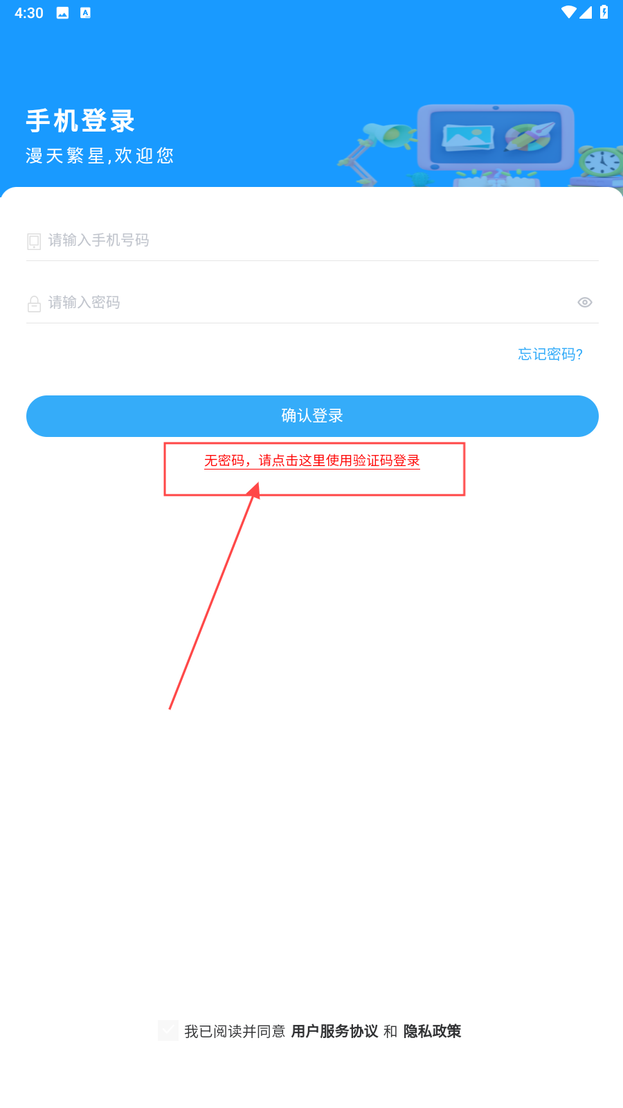 1、打开应用,点击【无密码,请点击这里使用验证码登录】。