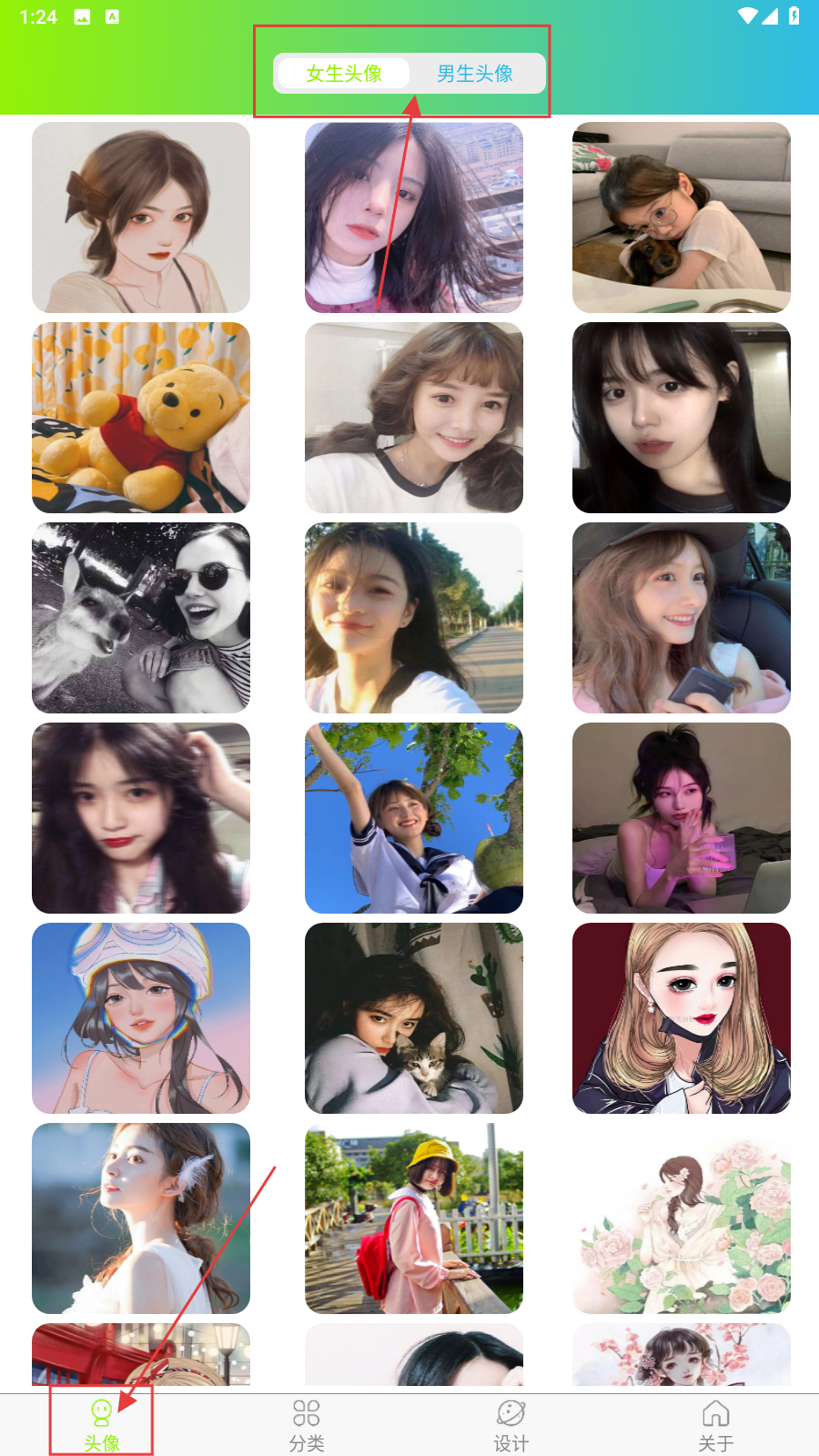 1、打开应用,在【头像】界面可以选择男生头像或者女生头像。