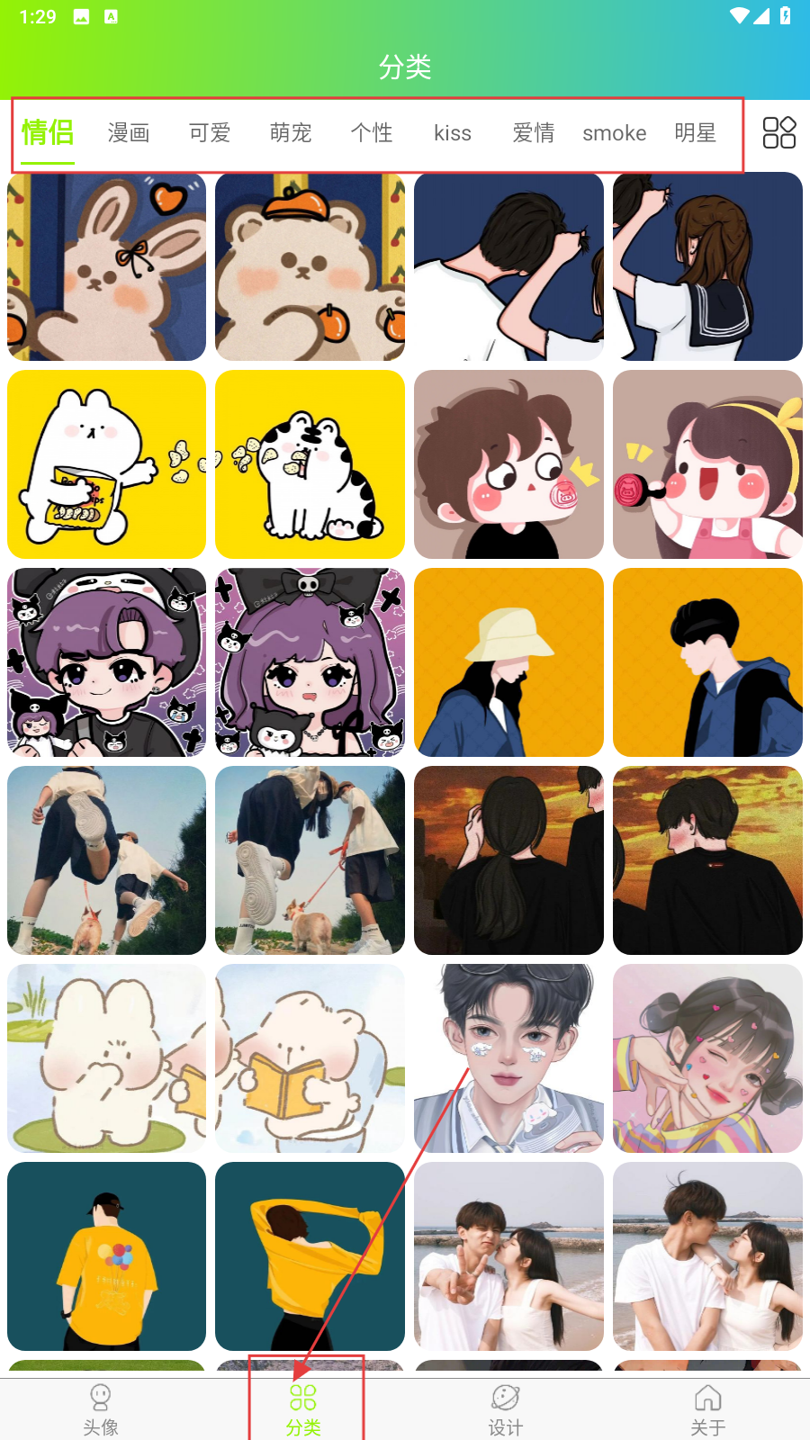 2、也可以点击【分类】选择喜欢的类型的头像。