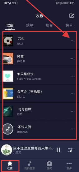 2、在【收藏界面】,浏览收藏项,点击播放歌曲,长按或点【…】进行删除、添加等管理操作。