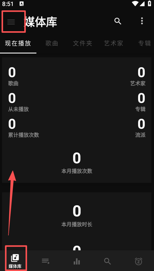 1、进入媒体库页面,点击左上角菜单按钮,展开导航列表,可选择播放列表、均衡器等功能。