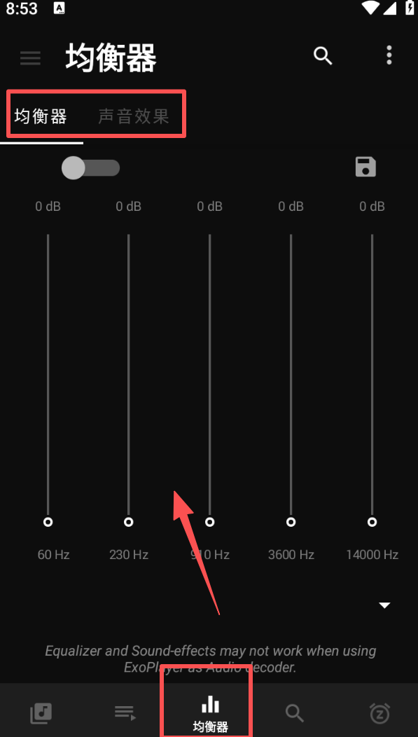 2、切换到均衡器页面,在 “均衡器”“声音效果” 标签下,调整不同频段的参数,优化音频播放效果。
