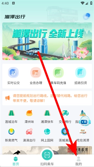 打开湘潭出行应用,点击底部导航栏中的“我的”选项,即可进入个人页面。