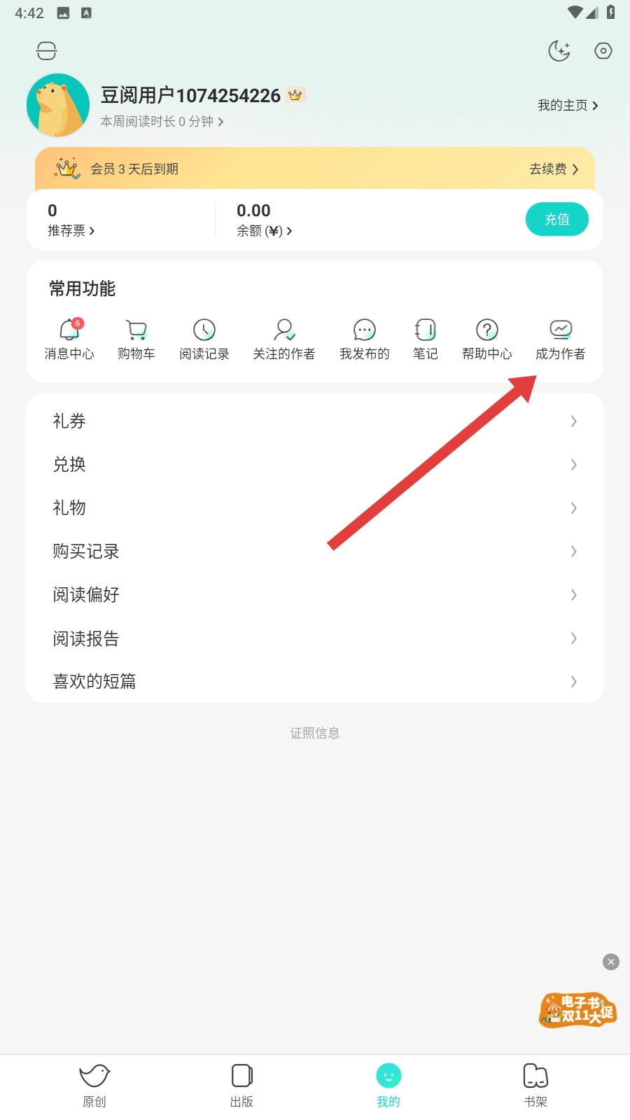 在【我的】页面中,找到并点击【成为作者】选项,即可进入作者申请页面。