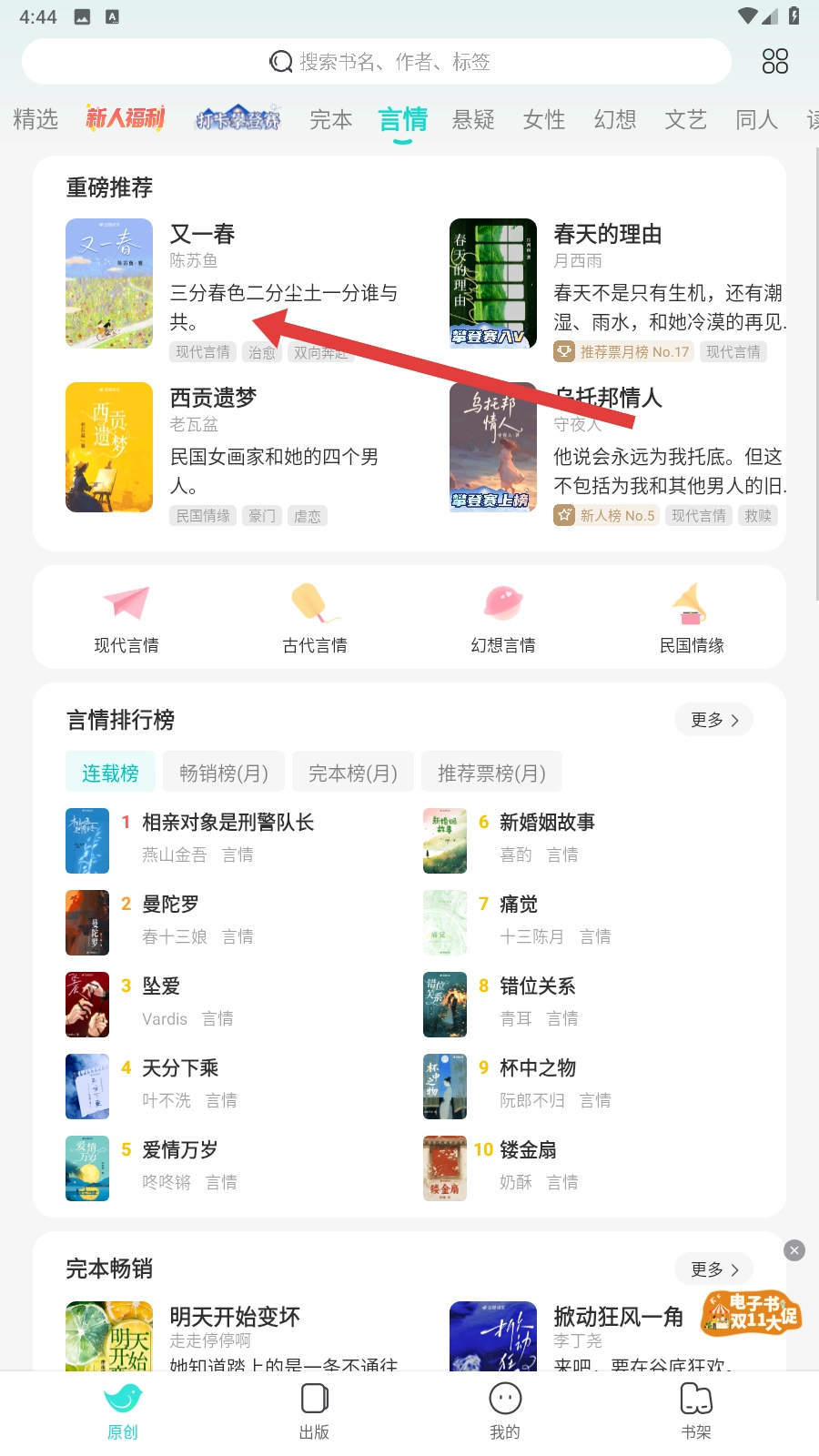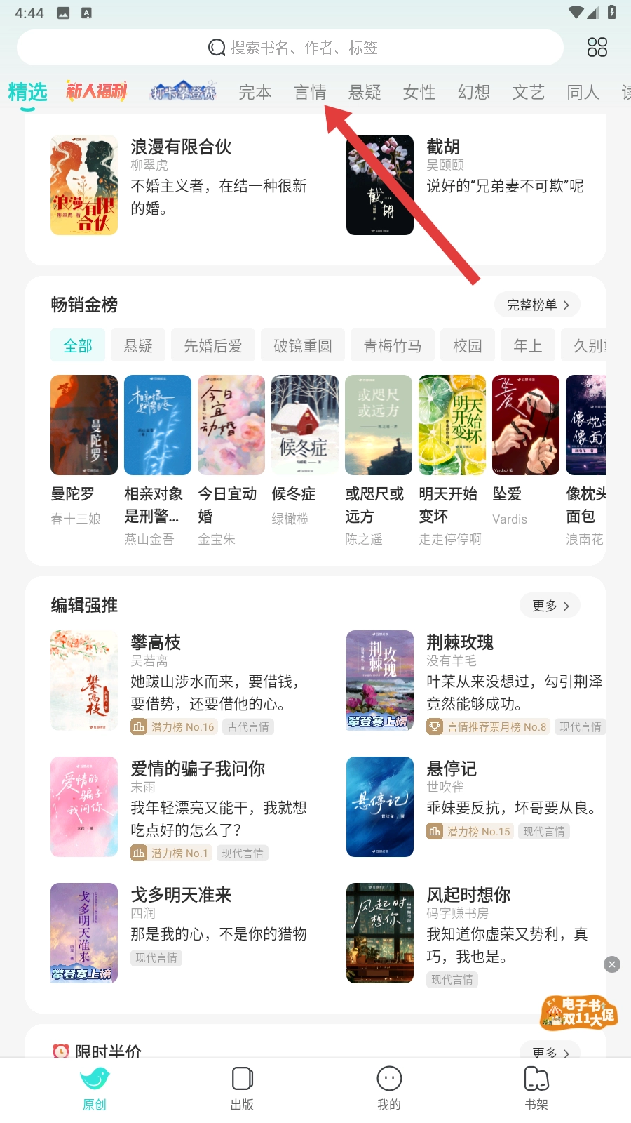 我们打开豆瓣阅读后,点击【言情】之类的分类标签,挑选自己感兴趣的小说类别就好啦。
