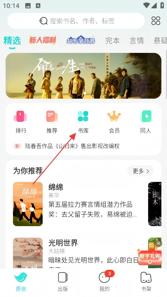 在原创页面,点击【书库】选项,进入分类页面。