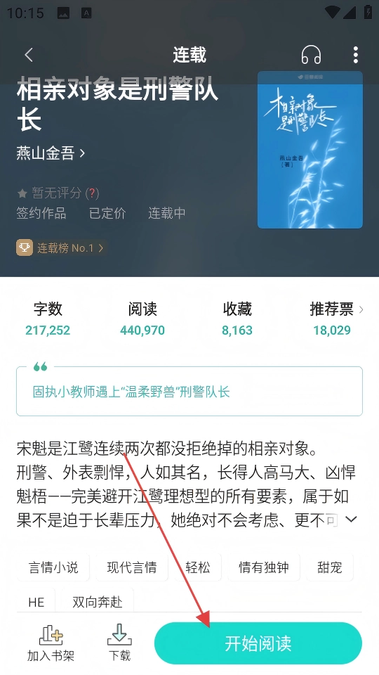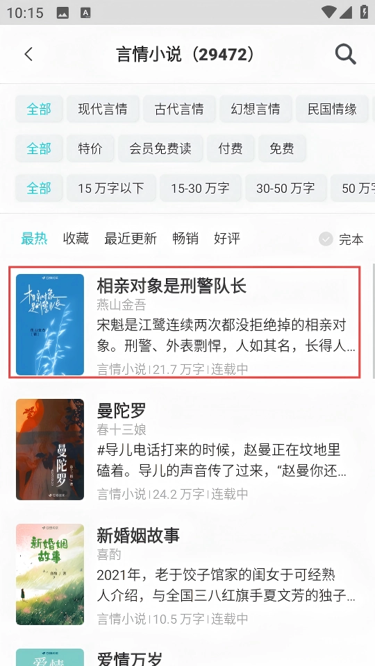 在言情小说的列表页面里,找到《相亲对象是刑警队长》这部小说并点击,就能进入到它的详情页面。