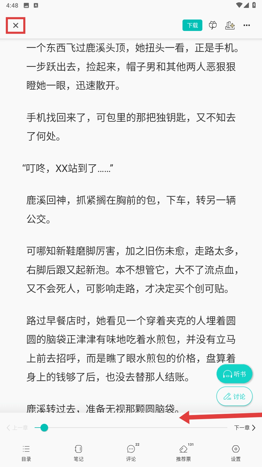 阅读时,向左滑动屏幕就能翻页,要是想退出,点击左上角的叉号按钮就可以啦。