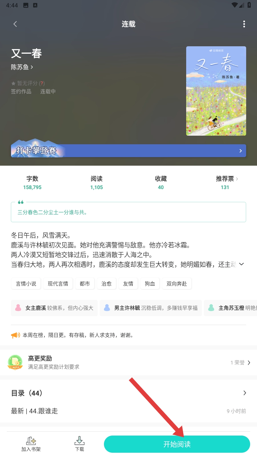 在分类页面浏览时,要是看到像《又一春》这样合心意的小说,就点击进入它的详情页面吧。