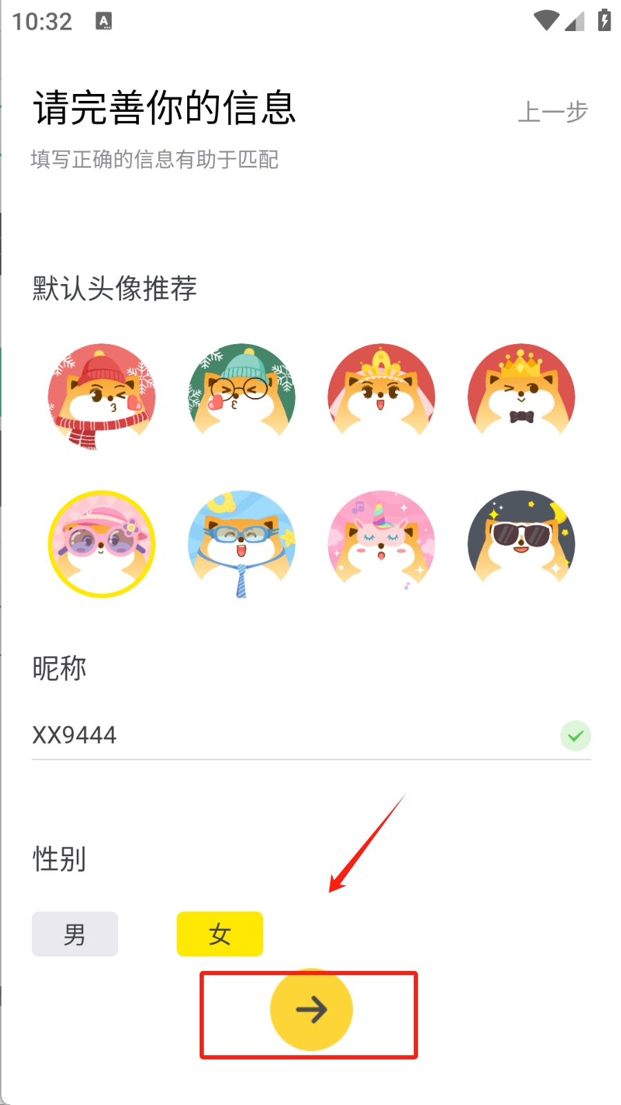 1、在个人信息页面,选择性别并点击下一步,完善您的个人信息。