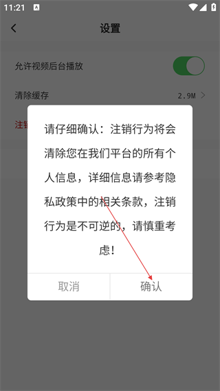 4、在确认弹窗中,点击【确认】,即可完成账号注销。
