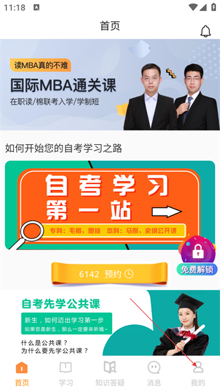 1、进入该自考/MBA培训类App首页,可浏览课程、预约学习内容。