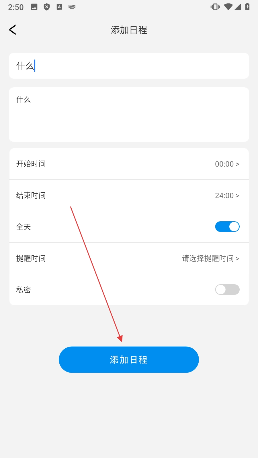 在添加日程页面填写【信息】,准备添加。