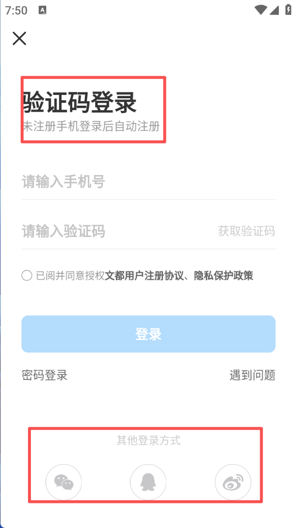 4、进入登录界面后,可通过验证码登录(未注册手机登录即自动注册),也能选择微信、QQ 等其他方式完成登录操作。