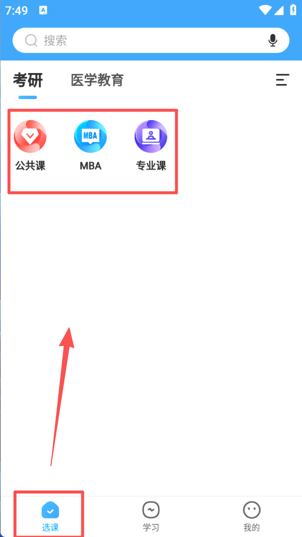 2、点击底部 “选课”,页面会显示已选考试类型下的细分板块,比如考研类包含的公共课、MBA 等内容都可在此查看。