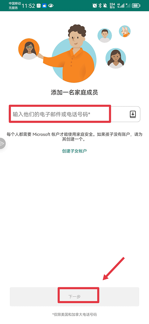 1、在添加家庭成员界面中将组织者的邮箱或电话号码输入,并点击下一步