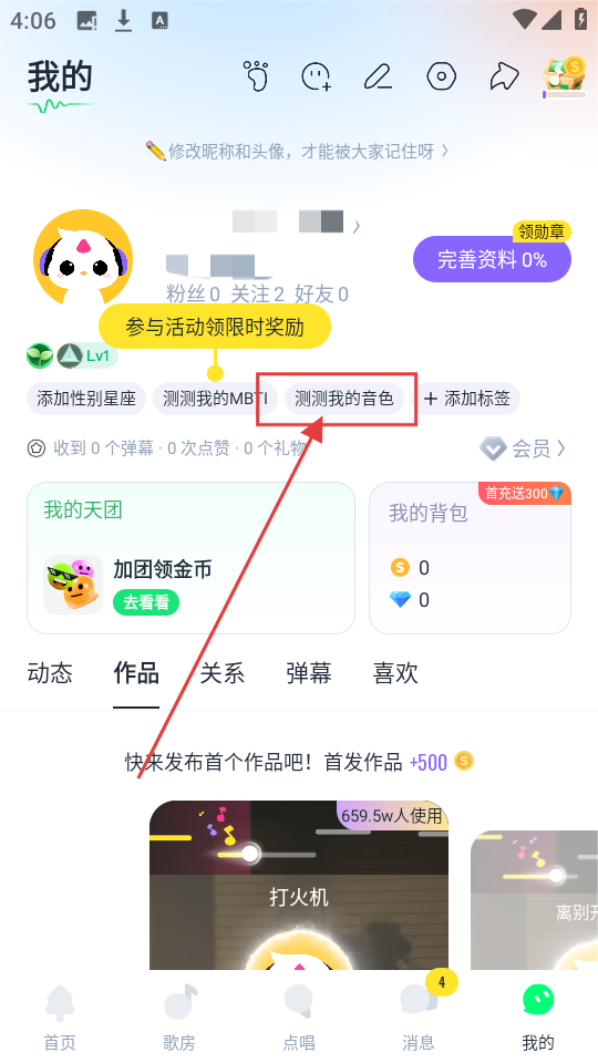 1、在“我的”页面,看到【测测我的音色】按钮,点击它就能开启音色测试,超有趣的。