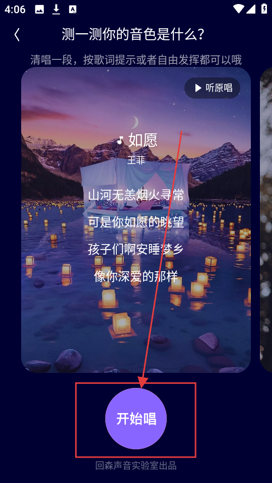 3、到了测试唱歌的页面,点击【开始唱】按钮,就可以跟着歌词清唱,进行音色测试啦。