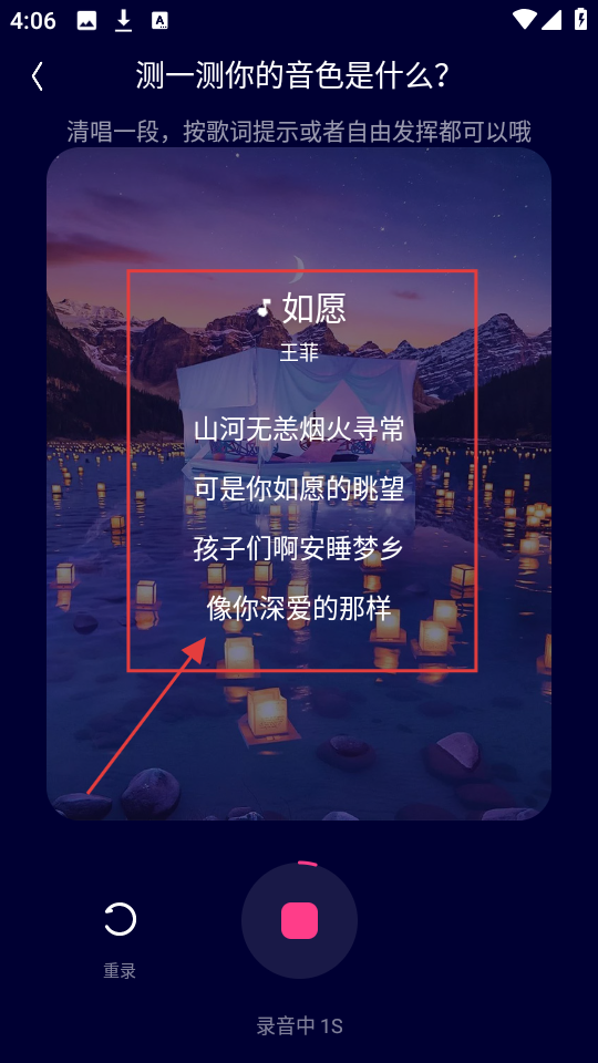 4、唱歌时,按照屏幕上显示的歌词,像【山河无恙烟火寻常】这些,尽情演唱,完成测试。