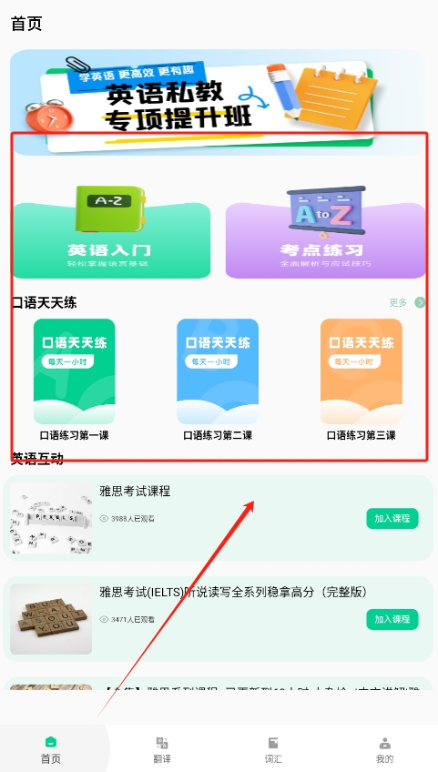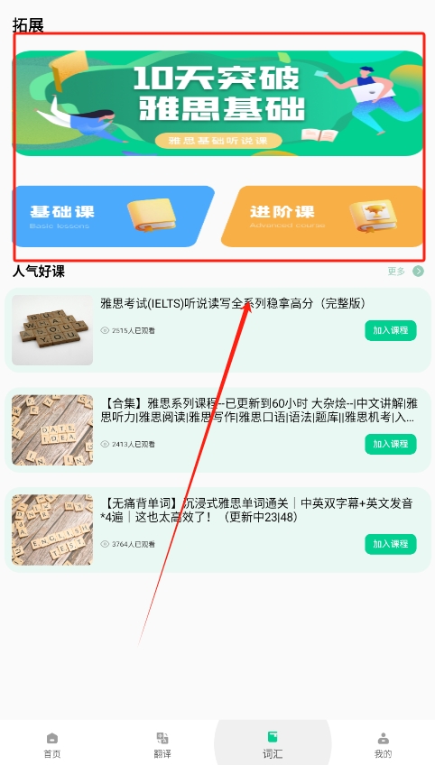 1、下载安装后,打开开心词典,首页展现各类学习模块,根据需求选择想要学习的内容,如基础词汇或雅思专项课程。
