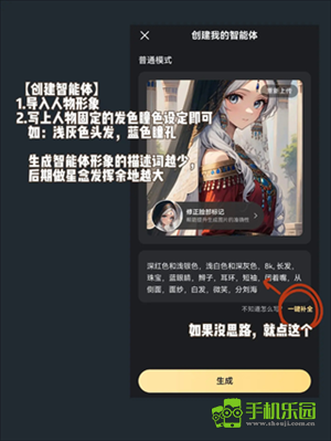 导入人物形象时,只需写明其固定的发色与瞳色设定,例如:浅灰色头发、蓝色瞳孔。生成智能体形象的描述词越少,后续进行星念创作时的发挥空间就越大。