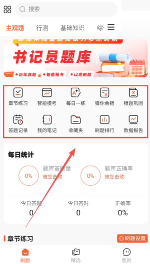 2、在主页上选择所需的刷题模块,包括每日精选、高频考点及历年真题等,用户可以自由切换不同类型的练习。
