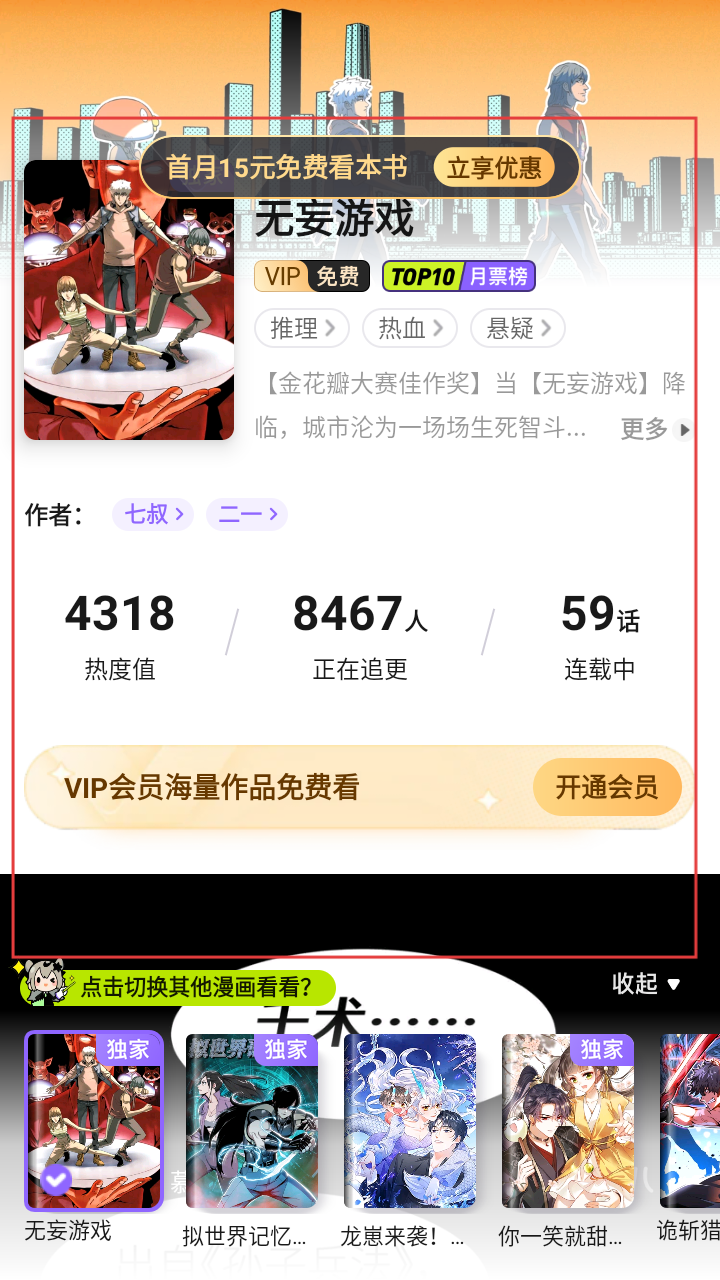 4、进入漫画详情页,可查看漫画的热度值、追更人数、连载话数等信息,了解漫画题材和作者,也可开通会员享受更多权益。