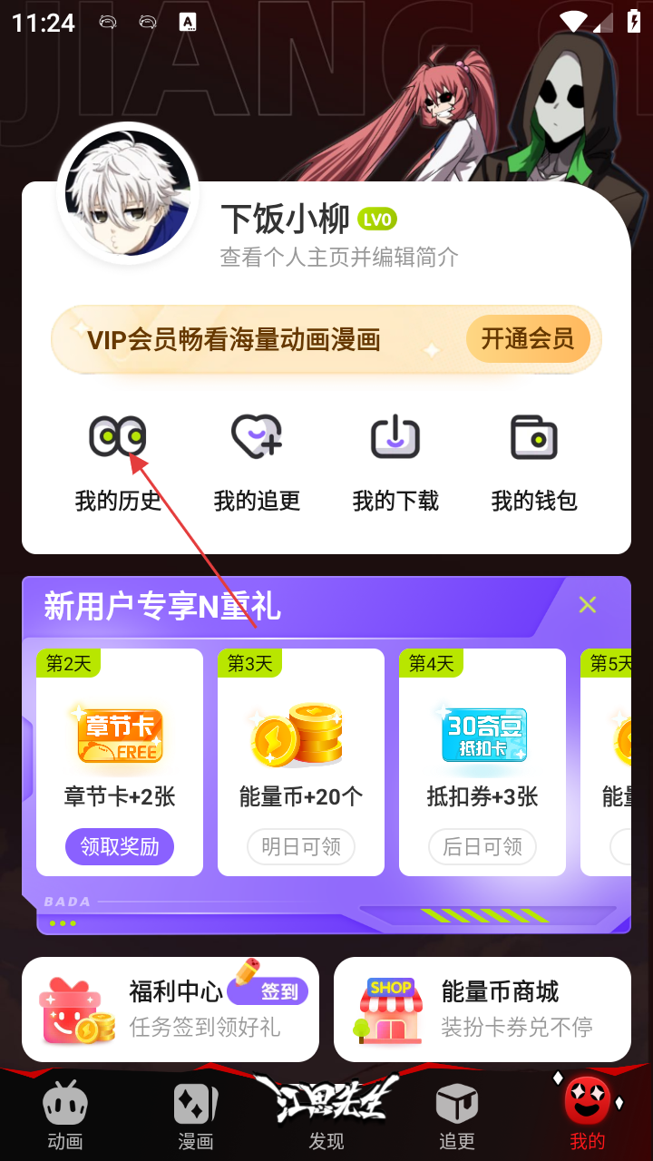 2、在【我的】页面,点击【我的历史】可进入阅读历史界面,还能查看我的追更、我的下载等内容。