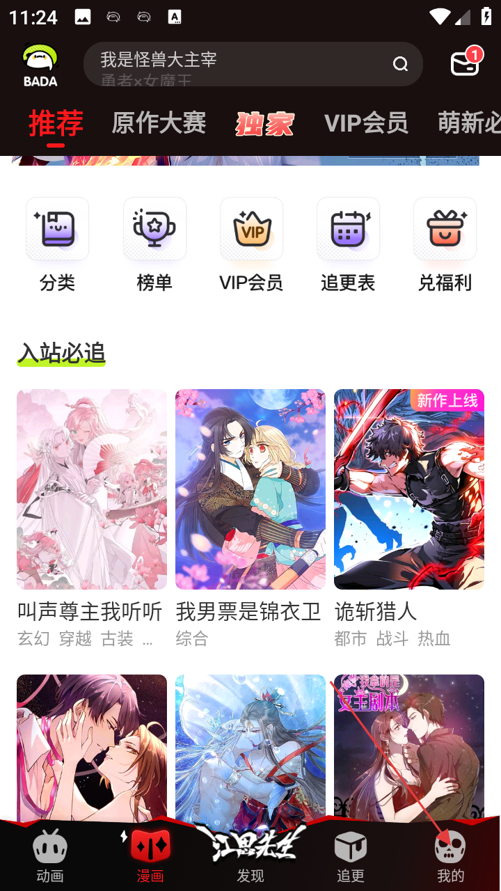1、在软件首页,可浏览推荐漫画,通过【分类】【榜单】【VIP会员】等功能查找资源,点击【我的】进入个人页面。