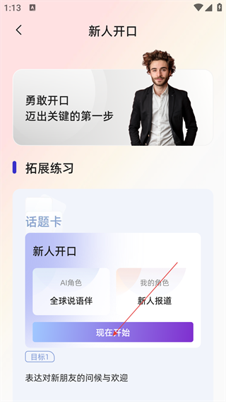 2、进入【新人开口】页面,可选【全球说语伴】等AI角色,点击【现在开始】按钮即可进入口语对话练习环节。