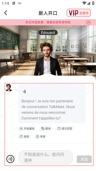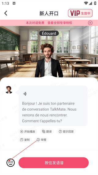 3、对话界面会收到AI语伴的【Bonjour!-Je-suis-ton-partenaire-de-conversation...】问候,按【按住发语音】按钮回复。