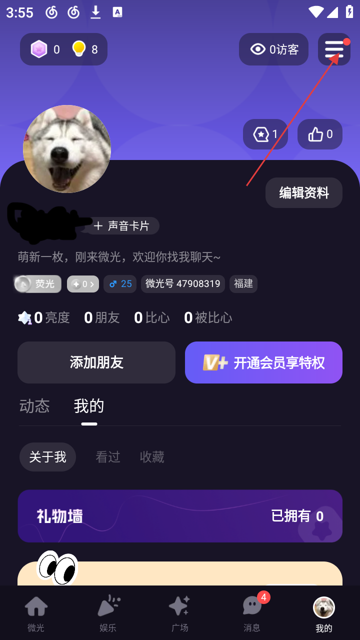 1、打开微光APP,进入首页后,可看到【创建房间】【随缘加入】等板块,点击右下角【我的】,进入个人页面。