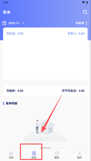 2、在账单页查看2025-12月汇总,确认支出收入与结余为零。