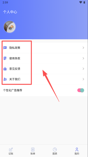 4、进入个人中心,关闭个性化广告并阅读隐私政策保障安全。
